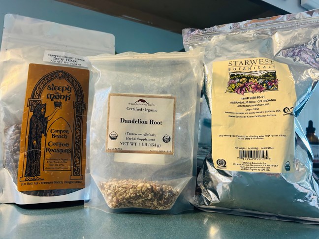 Here’s my recipe for my standard cup of coffee in the morning (decaf). 1 part each of: decaf coffee, dandelion root, and astragalus. I have pics of how finely I grind the herbs as well. I get my coffee from Sleepy Monk since my clinic at the coast in Cannon Beach was just a few doors down and the people working there are the best ever and the coffee is always organic and amazing!!! The physical cafe is closed now, but you can still get coffee online. And then for herbs my standard is Mountain Rose Herbs. Sometimes Chinese herbs are sourced from other companies though.
